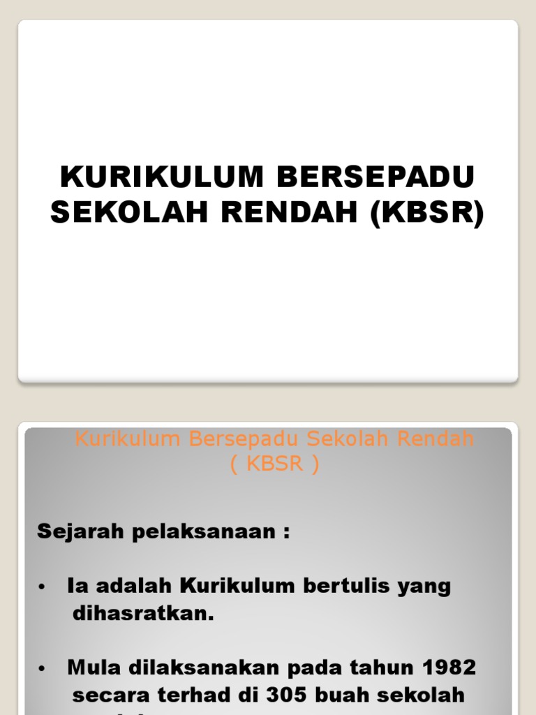 Kurikulum bersepadu sekolah rendah kbsr diwujudkan pada tahun 1989. Kurikulum baru sekolah rendah kbsr pada tahun 1983 dan kurikulum bersepadu sekolah menengah kbsm pada 1989 yang menggalakkan guru guru melaksanakan pendekatan penerapan nilai merentas kurikulum pusat perkembangan kurikulum 1988. Kurikulum sekolah rendah mula diperkenalkan pada tahun 1983 dengan menggunakan nama kurikulum baru sekolah rendah. 1993 kurikulum baru sekolah rendah ditukar kepada kurikulum bersepadu sekolah rendah. Secara umumnya pada tahun 1983 satu kurikulum sekolah rendah telah diperkenalkan dan dikenali sebagai kurikulum baru sekolah rendah kbsr.