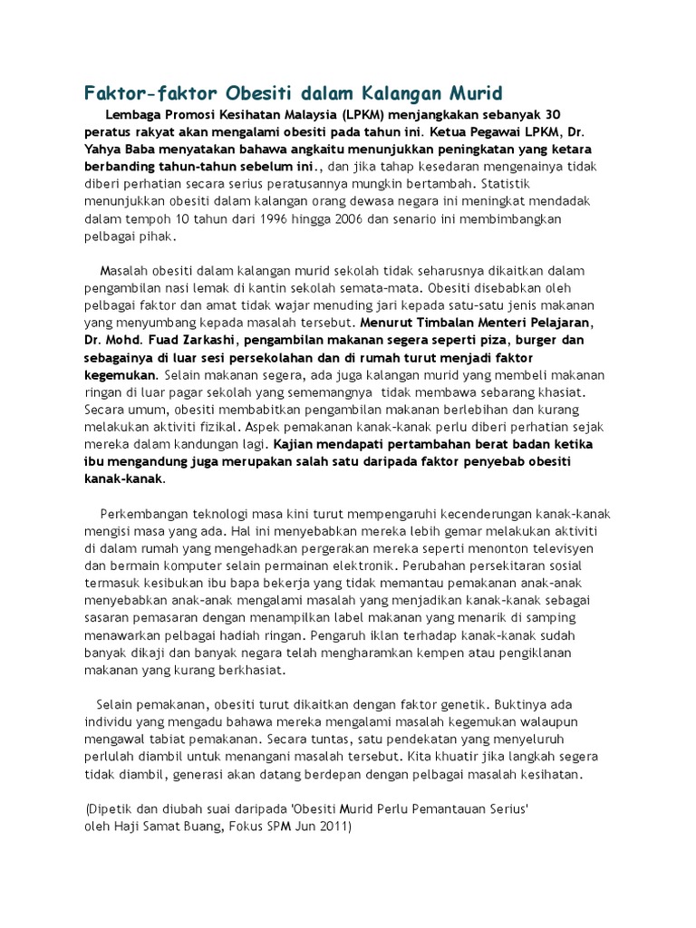 Obesiti menimbulkan pelbagai masalah kesihatan seperti penyakit jantung. Senaman perlu dilakukan secara berterusan setiap hari dalam tempoh 20 hingga 30 minit sahaja bergantung kepada aktiviti yang dilakukan. Berdoa dan meluahkan rasa hati kepada tuhan dapat meringankan bebanan. Punca dan cara mengatasi masalah obesiti 10 27 pg esei.