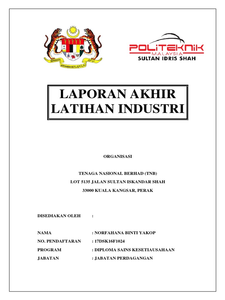 Buku laporan latihan industri oleh ahmad shafiq bin jamian 19dat12f2052 di achi jaya plantations sdn bhd lot 677 jalan kilang 85400 chaah johor buku laporan ini dikemukakan kepada pensyarah penilai di jabatan perdagangan sebagai memenuhi sebahagian dari syarat penganugerahan diploma perakaunan politeknik muadzam shah jun 2014 i. Adanya latihan industri di politeknik seluruh malaysia maka pelajar pelajar kursus diploma dapat menjalani latihan industri di tempat yang telah dipilih oleh mereka berkaitan dengan jurusan oleh itu objektif latihan industri ini adalah mahu memberi kesan kepada para pelajar dalam melaksanakan tugas yang diberi dengan sebaik mungkin serta mahu melihat sejauh mana. Buku laporan latihan industri ini adalah kepada jabatan perdagangan politeknik kota bharu sebagai syarat utama untuk penganugerahan diploma oleh kementerian pengajian tinggi malaysia. Panduan penyediaan laporan akhir latihan industri jabatan perdagangan.