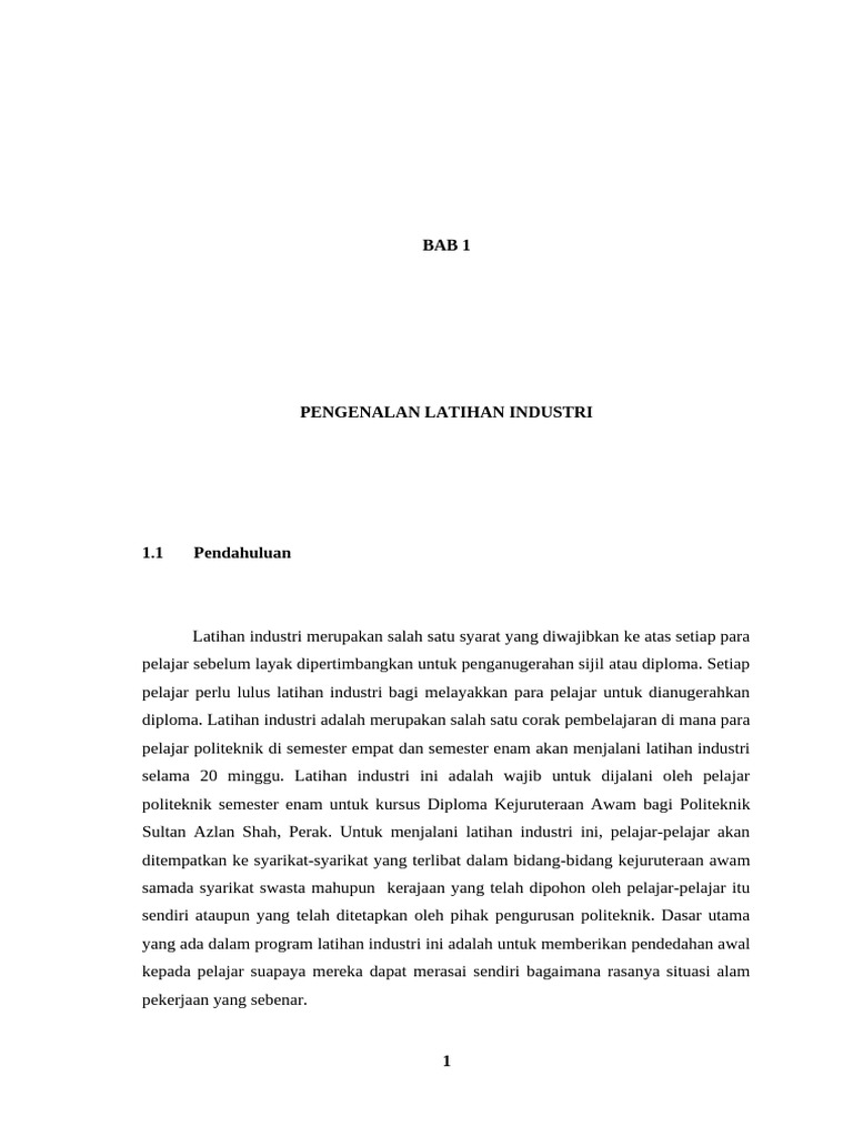 1 2 objektif latihan industri setiap pelajar politeknik kementerian pengajian tinggi malaysia akan menjalani latihan industri di firma firma kerajaan atau swasta selama tempoh satu semester bagi. Latihan industri ini adalah wajib untuk dijalani oleh pelajar politeknik semester enam untuk kursus diploma kejuruteraan awam bagi politeknik sultan azlan shah perak. Laporan latihan industri lengkap politeknik kota kinabalu 1. Saya berharap dengan adanya latihan industri politeknik dapat menghasilkan bakal.