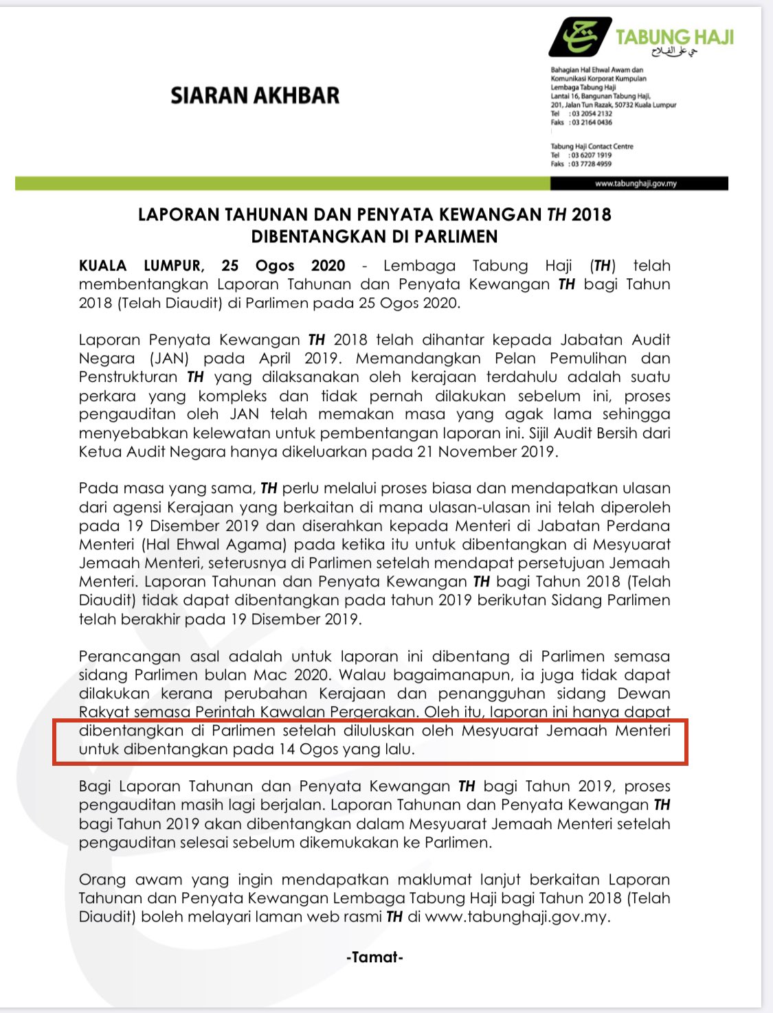 Kuala lumpur 25 ogos 2020 lembaga tabung haji th telah membentangkan laporan tahunan dan penyata kewangan th bagi tahun 2018 telah diaudit di parlimen pada 25 ogos 2020. Laporan penyata kewangan th 2018 dihantar kepada jabatan audit. Ia membuktikan bagaimana dasar dasar bodoh ph telah meletakkan tabung haji di dalam risiko yang tidak sepatutnya. Alhamdulillah dapatan ketua audit negara kan dalam laporan beliau telah membuktikan kebenaran kita selama ini.