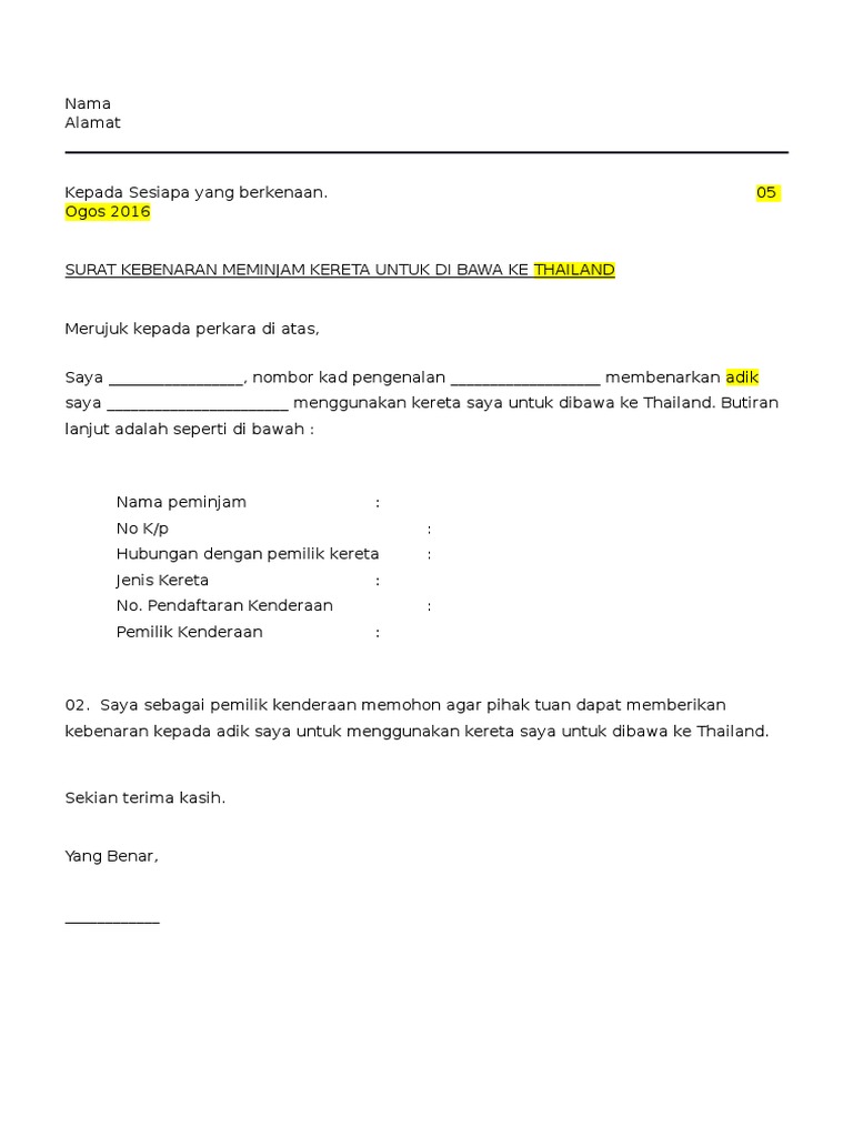 Membawa contoh surat kebenaran menggunakan kenderaan. Contoh surat permohonan menggunakan kenderaan jabatan. Saya md suhaimin b muhamad pemilik kenderaan iaitu kereta jenis perodua kancil 660 yang mempunyai nombor pendaftaran dam 8307 dengan seikhlas hati memberi kebenaran kepada anak saya untuk membawa kenderaan tersebut semasa sesi kuliah di institut pendidikan guru kampus kota bharu kelantan. Surat kebenaran membawa kenderaan 1 surat rasmi kebenaran menggunakan kenderaan rasmi ru contoh surat rasmi permohonan menggunakan bilik mesyuarat arasmi contoh surat permohonan sewa tapak gerai. Kenderaan tersebut perlu mengikut bilangan tempat duduk dan tidak boleh membawa lebih muatan.