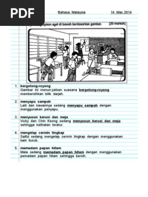 Menyusun meja dan kerusi bina ayat. Seorang murid lelaki mengeluarkan buku dari beg dan meletakkannya di atas meja. Air memainkan peranan yang penting dalam kehidupan kita. Bekerjasama mencuci longkang kantin sekolah. T e k n i k m e n j a w a b b a h a g i a n c.