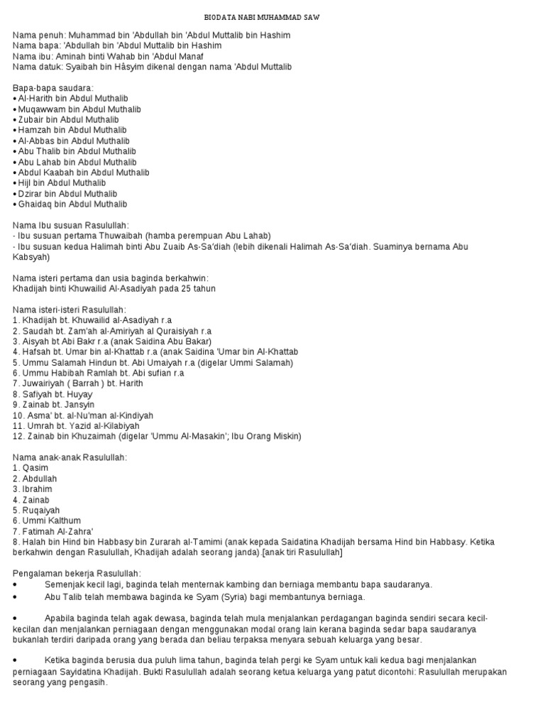 Biodata nabi muhammad s a w. Muhammad bin abdullah arab jawi. Nabiyullah urutan ke 25 ini tidak hanya memiliki nama muhammad akan tetapi juga memiliki nama dan gelar yang disandangnya. Nabi muhammad saw rasulullah saw lahir.