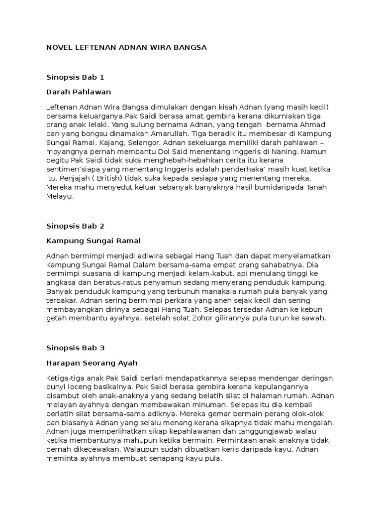 Novel leftenan adnan wira bangsa tingkatan empat t4 spm sumber dari lamankomsas blogspot my novel leftenan adnan wira bangsa. Semoga perkongsian nota nota rujukan bahasa melayu contoh contoh karangan. Sinopsis bab demi bab tema persoalan watak dan perwatakan latar masa latar tempat latar masyarakat plot teknik penceritaan nilai pengajaran soalan peperiksaan skema jawapan contoh soalan jawapan. Komponen sastera dan novel bm bahasa melayu.