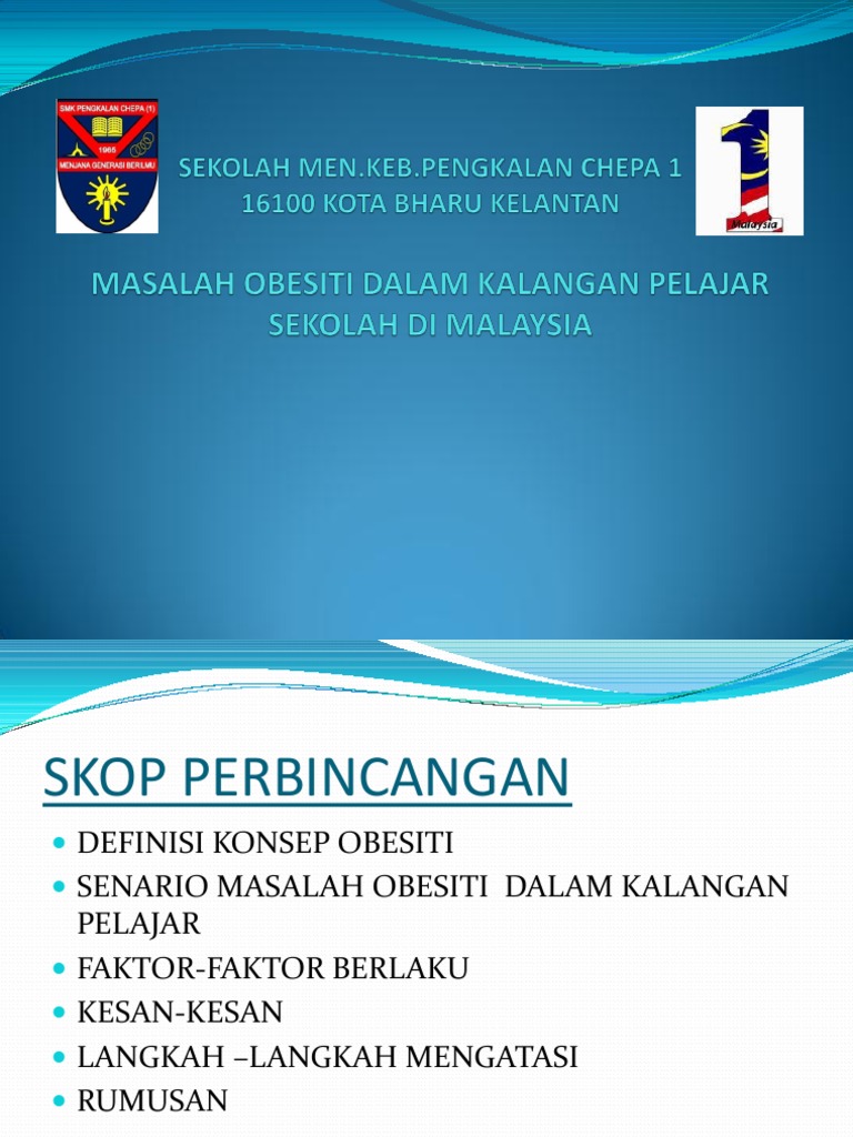 Obesiti di kalangan pelajar sekolah. Senario terkini kelebihan berat badan dan obesiti di kalangan kanak kanak adalah masalah yang kian meningkat di malaysia menurut statistik yang dikeluarkan oleh persatuan kajian obesiti malaysia maso pada tahun 2005 mencatatkan 27 atau setiap satu dari empat rakyat malaysia dilaporkan mempunyai masalah berat badan yang berlebihan. Halaman 1092 bermaksud kegemukan yang disebabkan. Dalam usaha menangani masalah obesiti ini maka pakar nutrisi akan dihantar ke sekolah bagi mengatasi isu kegemukan dalam kalangan murid di negara ini. Baru baru ini ramai yang memperkatakan berkenaan dengan isu obesiti di kalangan pelajar sekolah.
