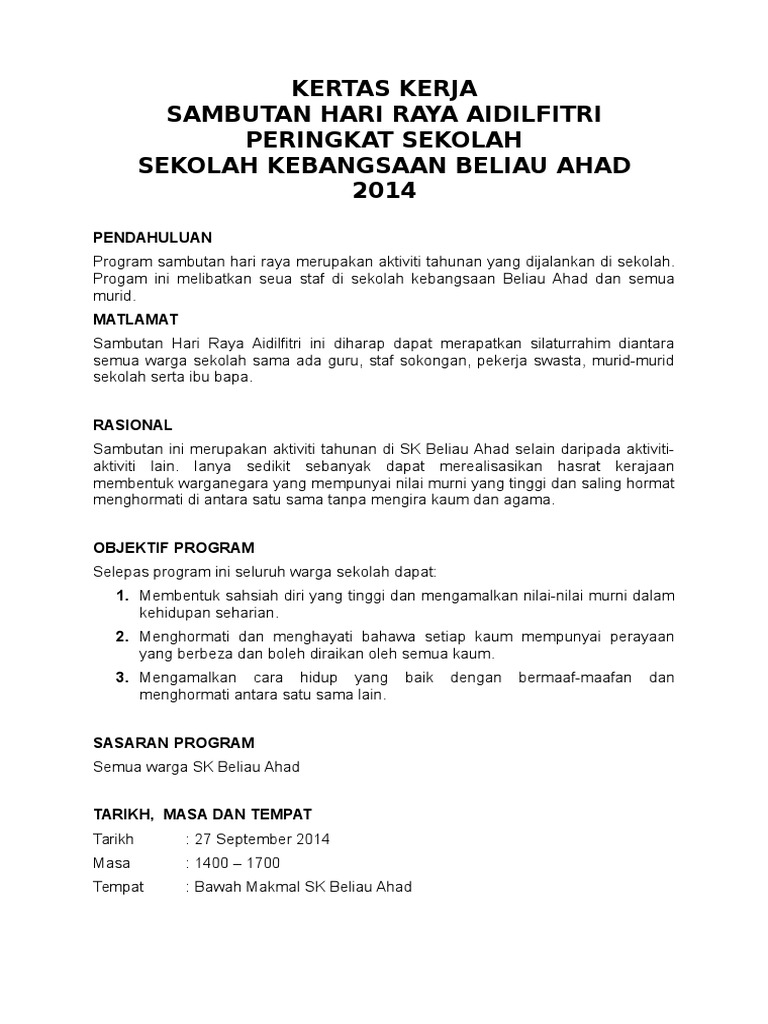Kertas kerja majlis sambutan hari raya aidilfitri peringkat sk kinasaraban 2014 sekolah kebangsaan kinasaraban kota belud. 2 2 meraikan hari raya aidilfitri yang disambut oleh komuniti beragama islam yang merupakan anggota majoriti di sekolah rendah kebangsaan kinasaraban. Walaupun diadakan pada skala yang sederhana berbanding majlis yang sama pada tahun sebelumnya kemeriahannya tetap terasa dan objektif utamanya telah tercapai iaitu untuk merapatkan hubungan silatuhrahim sesama warga. Hari ni tadika anak cikla kakak damia dengan abang ammar mengadakan majlis 4 in 1 kata orang.