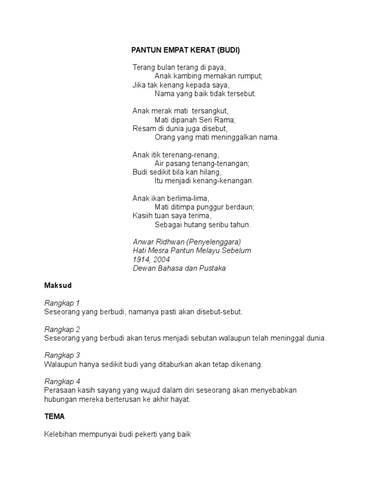Puisi tradisipantun empat kerat budi 7. Bentuk pantun yang paling luas digunakan ialah pantun empat kerat. Tafsiran maksud pantun pantun empat kerat budi terang bulan terang di paya anak kambing memakan rumput jika tak kenang kepada saya nama yang baik tidak tersebut. Rangkap 2 seseorang yang berbudi akan terus menjadi sebutan walaupun telah meninggal dunia.
