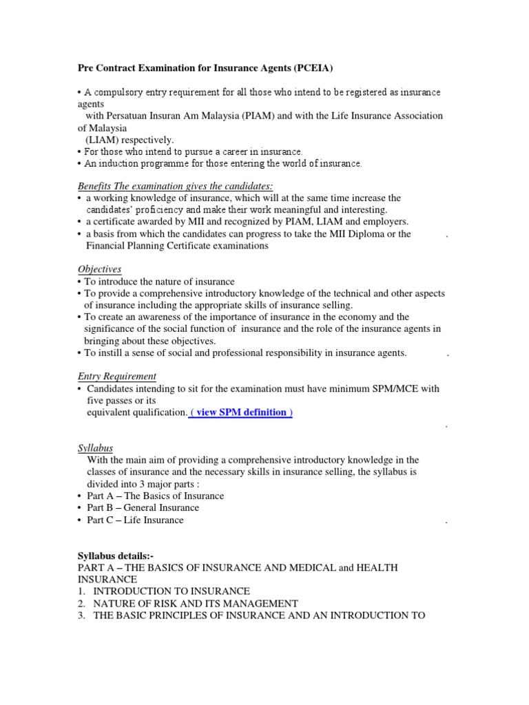 Emphasis is placed on the following areas. Peperiksaan pra kontrak untuk ejen insurans cetakan pertama 1996 diterbitkan oleh the malaysian insurance institute cetakan kedua 1996 cetakan ketiga 1997 cetakan keempat 1998 cetakan kelima 1999 cetakan keenam 2000 cetakan ketujuh 2001 cetakan kelapan 2001 cetakan kesembilan 2009 teks pembelajaran. A candidate who wishes to sit for part b or part c only must successfully complete parts ab general insurance route or parts ac life insurance route before register the examination. Br pceia english version 1.