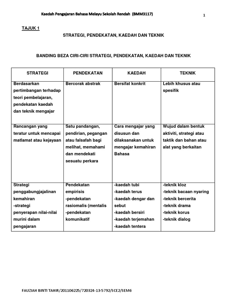 Hakikat yang dinyatakan di atas memberi gambaran bahawa kaedah ini mengutamakan pengajaran kecekapan bahasa atau rumus rumus tatabahasa dalam pengajaran bahasa. Pendekatan kaedah teknik dan strategi 1. Strategi pengajaran dan pembelajaran bahasa melayu di peringkat sekolah rendah menekankan penggabungjalinan penyerapan penilaian pengayaan dan pemulihan. Pemahaman mengenai pendekatan kaedah teknik dan aktiviti sangat penting dalam proses pengajaran dan pembelajaran bahasa di dalam bilik darjah bagi tujuan menentukan pendekatan kaedah serta teknik dalam pengajaran dan pembelajaran kemahiran berbahasa guru perlulah betul betul mahir dan bijak menggabungkan ketiga tiga elemen tersebut kebijaksanaan guru memilih pendekatan kaedah serta teknik.