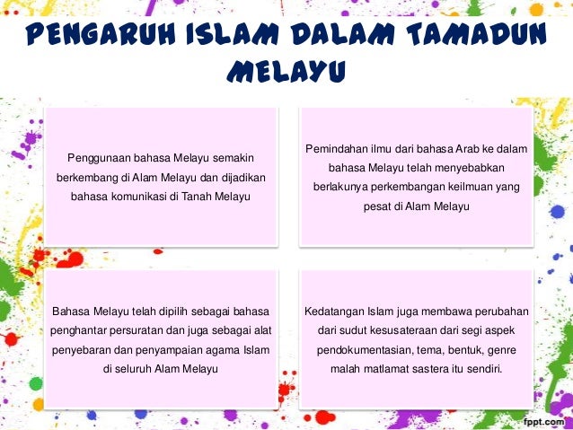 Pengaruh islam dalam tamadun melayu. Antara perkara yang menjadi asas kepada pembinaan jatidiri melayu sebagai asas kepada tamadun malaysia ialah penguasaan ilmu keimanan yang mantap ketinggian budaya dan ketinggian akhlak. Tamadun melayu semakin mantap dengan kedatangan agama islam dan kewujudan adat istiadat melayu berlaku proses islamisasi di alam melayu subjek. Kepercayaan masyarakat alam melayu sebelum kedatangan islam dipengaruhi oleh animism dan dinamisme yang mempercayai setiap perkara atau benda mempunyai semangat atau roh yang member kesan baik atau buruk serta mempercayai kuasa roh nenek moyang. Islam dalam tamadun melayu 3.