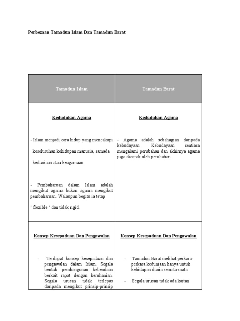 Persamaan dan perbezaan tamadun islam dan tamadun tamadun lain perbezaan 4 merangkumi aspek pemikiran mental fizikal islam sebagaimana agama dihayati dan dipraktikkan dalam kehidupan tanpa mengira etnik bangsa dan negara sebagaimana juga pemikiran sekular kelahiran tamadun. Tamadun islam berpaksikan akidah islam manakala tamadun barat tidak mempunyai paksi yang jelas. Konsep kesepaduan pengawalan. Tamadun dan peradaban islam sering difahami oleh segolongan besar umat islam sebagai fakta fakta sejarah tentang kegemilangan umat islam pada masa silam.
