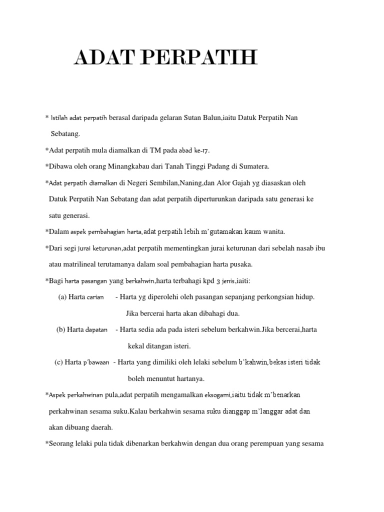 Di malaysia adat perpatih ini masih lagi wujud dan diamalkan oleh masyarakat melayu di negeri sembilan dan sebahagian dari melaka terutamanya masjid tanah. Buku ini membincangkan perkahwinan adat perpatih yang diamalkan di negeri sembilan. Adat perpatih berasal dan pagar ruyung sumatera yang diasaskan oleh datuk perpatih nan sebatang yang menjaga kawasan tanah sebelah darat dan diamalkan di negeri sembilan dan naning. October 23 2013 perkahwinan dalam adat perpatih.