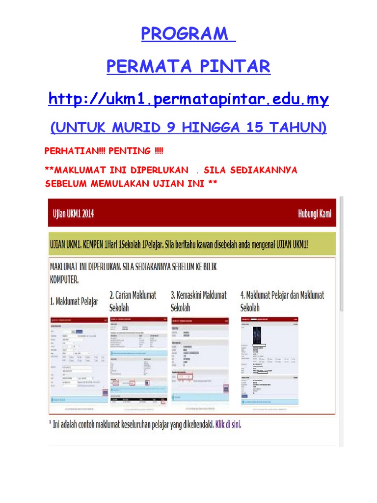 Permata pintar ialah satu program pendidikan untuk memenuhi keperluan pelajar pintar dan berbakat. Murid beragama islam berusia 8 tahun tahun 2 tahun 2017 untuk program perkhemahan permata insan di universiti sains islam malaysia usim 2017. Ujian ukm1 telah tamat pada 31 mei 2020 sila datang lagi pada tahun hadapan. Pendaftaran pelajar baru mykad mykid.