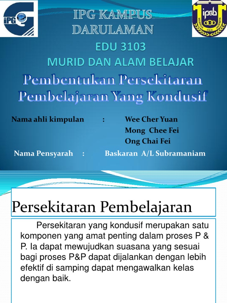 Persekitaran pembelajaran yang kondusif. Persekitaran ini mempunyai keupayaan untuk merangsang minat dan semangat murid untuk terus belajar. Tuntasnya persekitaran pembelajaran yang kondusif ialah tempat murid dapat melibatkan diri mengambil bahagian dan menumpukan perhatian dalam pembelajaran. Persekitaran pembelajaran yang kondusif ialah tempat murid dapat melibatkan diri mengambil bahagian dan menumpukan perhatian dalam pembelajaran. Pembentukan persekitaran pembelajaran yang kondusif 1.