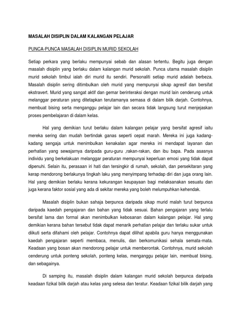 Jadi apakah faktor yang mendorong masalah ini berlaku dan apakah peranan yang boleh dilakukan oleh ibu bapa dan kerajaan. Jadi disiplin mempunyai kaitan rapat dengan kejadian disiplin pelajar yang terus merosot itu. Persediaan guru amat penting bagi menjamin ketenteraman serta disiplin murid murid. Punca punca masalah disiplin di peringkat sekolah punca punca utama salah laku yang dikenal pasti kebanyakannya disebabkan oleh pelajar sendiri.