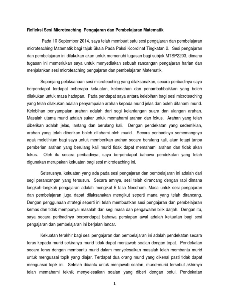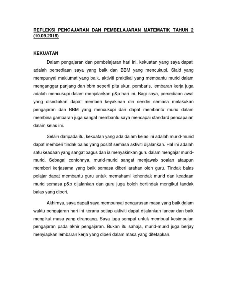 Refleksi pengajaran dan pembelajaran matematik. Kekuatan dan kekurangan dalam pengajaran yang telah dilaksanakan memang sudah menjadi kebiasaaan dalam dunia pengajaran. Dengan adanya pengesanan kekurang melalui aktiviti refleksi ekndiri sudah pasti sedikit sebanyak membantu kita sebagai guru bertindak untuk memperbaiki kelemahan tersebut supaya kita dapat melaksanakan pengajaran yang lebih baik pada masa akan datang. Ramai ahli psikologi yang terkenal telah menjalankan kajian tinjauan dan eksperimen terhadap pengajaran dan pembelajaran matematik dan telah mengemukakan berbagai bagai teori pembelajaran yang membawa kesan pesat terhadap kurikulum matematik masa kini. Matematik rph refleksi rancangan pengajaran harian 1 berat p1.