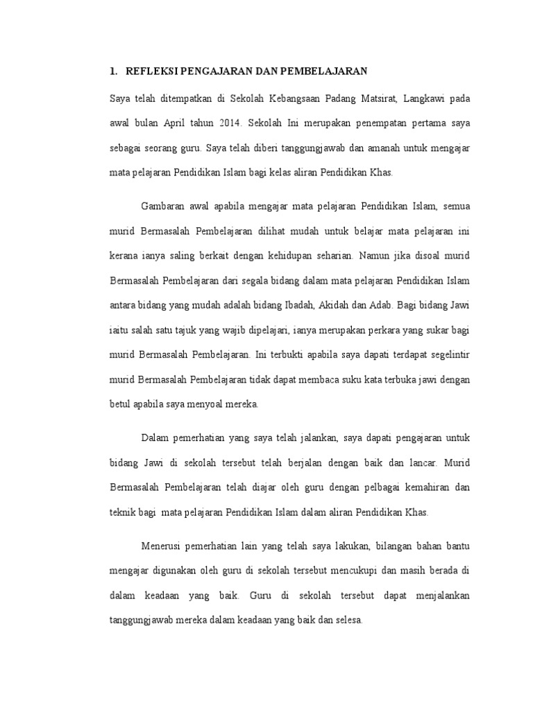 Refleksi pengajaran dan pembelajaran pendidikan islam. Refleksi ini dibuat berdasarksan pengajaran dan pembelajaran yang telah dijalankan pada tarikh 26 april 2012 bersamaan hari khamis. Bagi peserta didik kegiatan refleksi bermanfaat sebagai ruang ekpresi positif terhadap guru dan proses pembelajaran yang dialami. Bagi guru kegiatan refleksi bermanfaat sebagai ajang pengamatan tindakan kelas dalam rangka memetakan karakter dan daya saing peserta didik sehingga memudahkan dalam membagi kelompok menetapkan bobot materi menyelenggaran pengajaran dan melakukan evaluasi. Murid murid yang terlibat adalah dari kelas tahun 2 fokus seramai 35 orang.