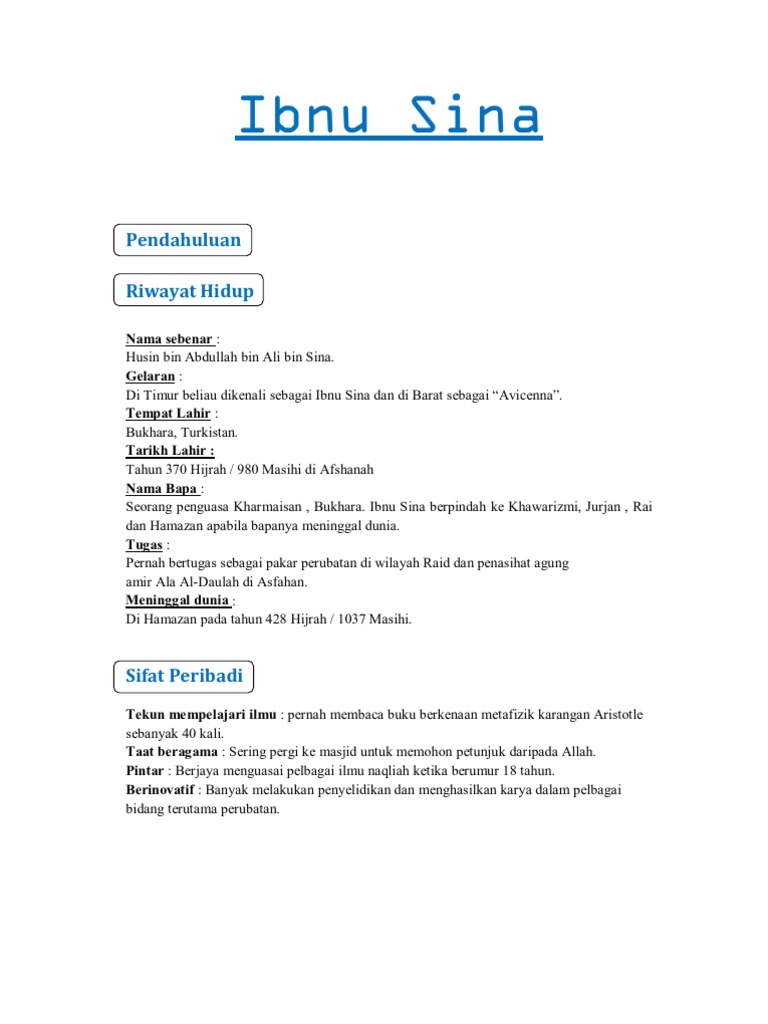 Riwayat hidup ibnu sina pdf. Ibnu sina avicenna nama lain. Daftar riwayat hidup syeikhur rais abu ali husein bin abdillah bin hasan bin ali bin sina yang dikenal dengan sebutan ibnu sina atau aviciena lahir pada tahun 370 hijriyah di sebuah desa. Nama sebenarnya ialah al husain bin abdullah bin al hasan bin ali bin sina. Riwayat hidup ibnu sina abu ali al hussain ibn abdullah ibn sina bahasa arab.