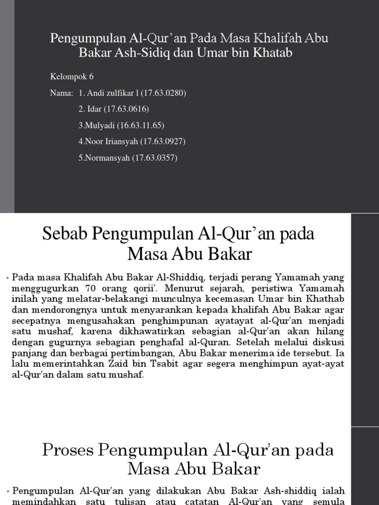 Sejarah pengumpulan al quran pada zaman khalifah. Secara kesimpulannya dapat kita katakan bahawa al quran melalui 3 fasa pengumpulan iaitu di zaman baginda nabi muhammad saw di zaman khalifah abu bakar ra dan di zaman khalifah uthman ra. Pengumpulan dari tiga fase ini mempunyai ragam yang berbeda. Hal itu dikarenakan belih terlihat. 9 sesungguhnya kami lah yang menurunkan al qur an dan sebaliknya kami benar benar memeliharanya bangsa arab pada awal islam sangat mengenal huruf tidak mengenal baca.