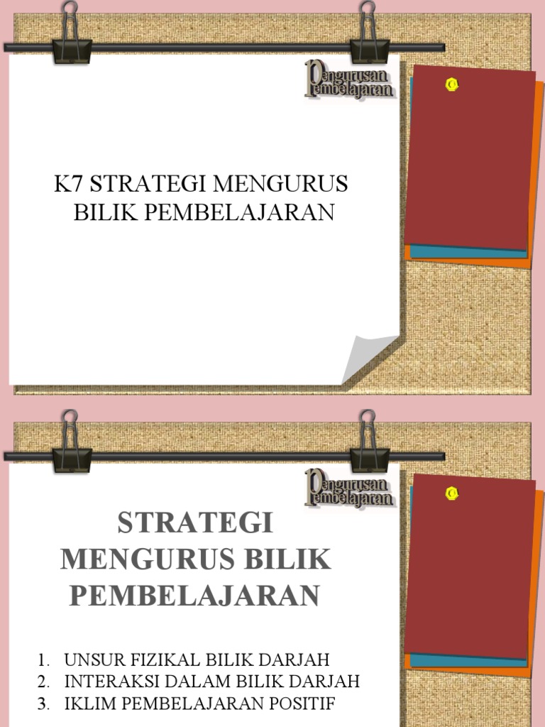 Kesimpulannya strategi mengurus bilik pembelajaran adalah berkait rapat dengan tiga faktor iaitu unsur fizikal interaksi dan iklim bilik darjah.