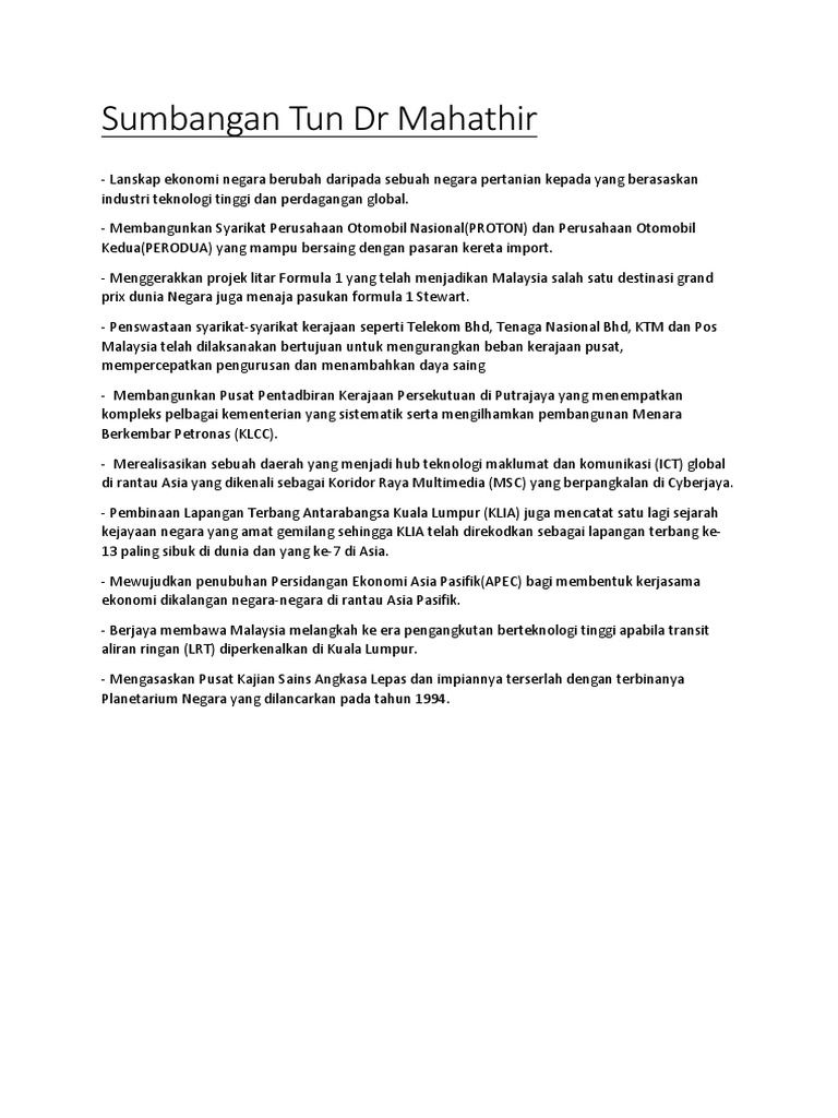 Sumbangan Tun Dr Mahathir Kepada Negara Secara Ringkas