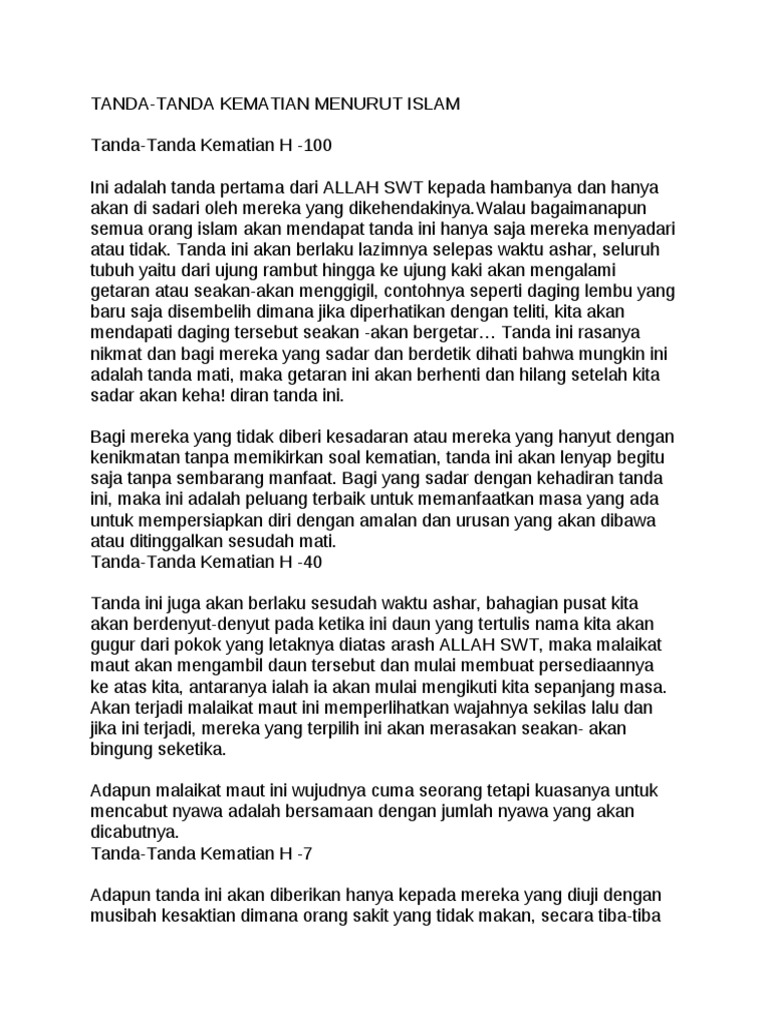 Telah kita tahu bahwa jika kita berbicara soal kematian dan kehidupan itu semua adalah urusan sang maha pencipta allah s w t. Hingga akhirnya beliau wafat ketika sang kakak mengkafani bagian wajahnya. Adapun tanda tanda akan datangnya kematian menurut imam al ghazali adalah seperti berikut ini. Misalnya ada yang bilang pada 100 hari menjelang kematian seluruh tubuh mulai dari ujung rambut sampai ke ujung kaki akan bergetar seakan akan menggigil mirip seperti daging sapi atau kambing yang baru disembelih.