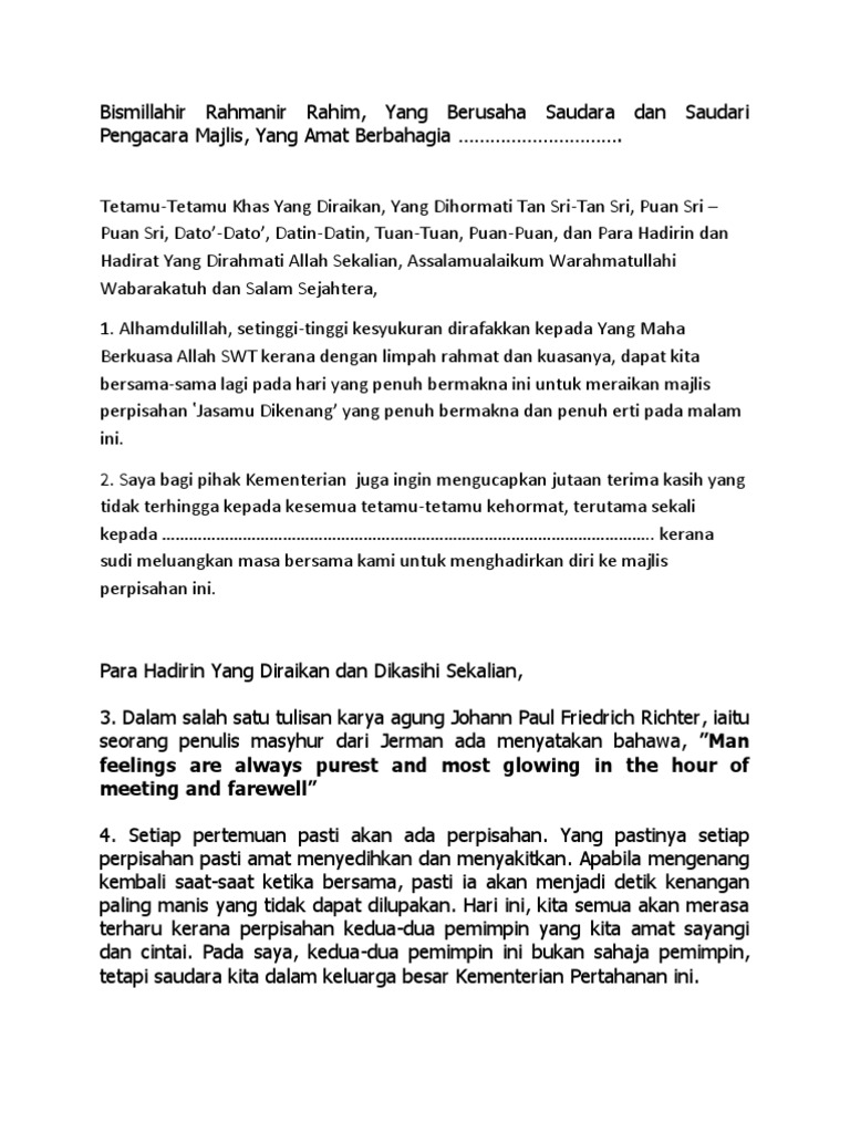 Jamuan makan malam pengawas amp penghargaan budi pengawas. Ucapan pengacara majlis sempena majlis malam jasamu dikenang smk demak baru. Dikesempatan ini juga kami ingin memohon ribuan kemaafan seandainya terkasar bahasa tersilap bicara sepanjang kami mengacarakan majlis ini. Teks ucapan majlis jasamu dikenang oleh yang berbahagia dato mohammad izat hasan ketua pengarah risda tempat.