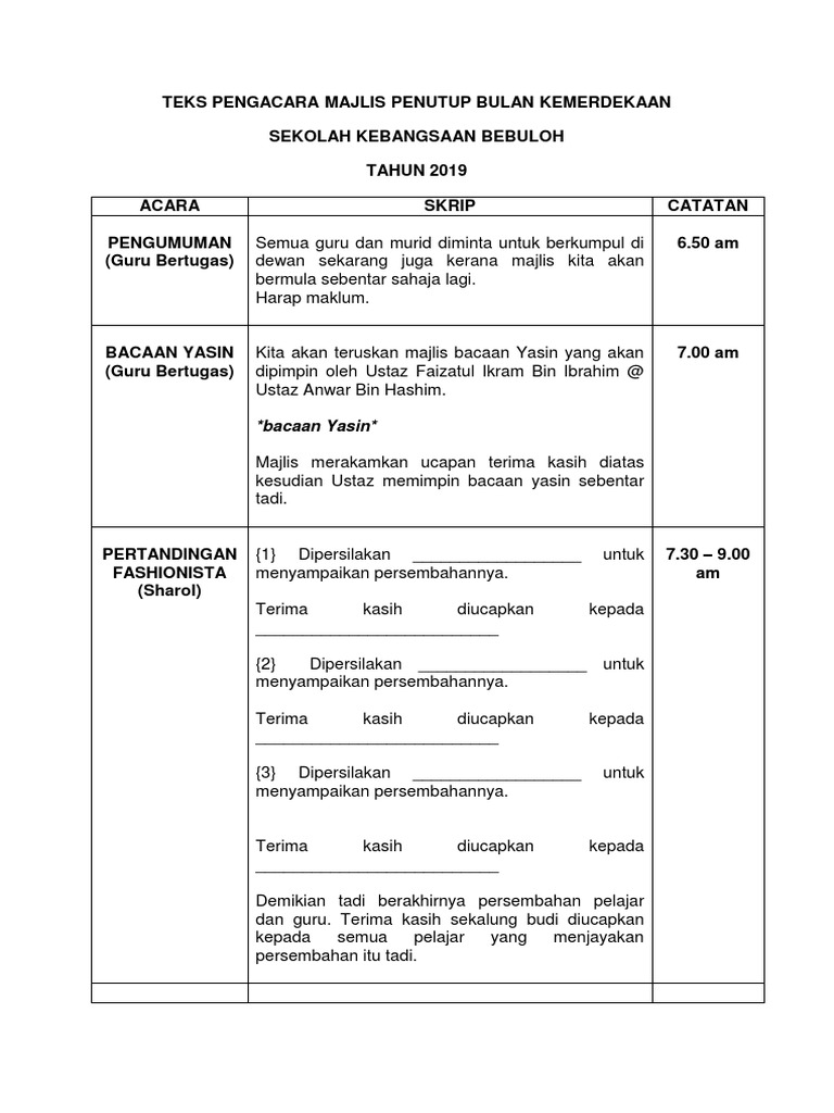 Teks ucapan majlis penutup bulan kemerdekaan. Dengan segala hormatnya dipersilakan. Tarikh keramat 31 ogos pasti diraikan di seluruh negara sebagai sambutan ulang tahun negara yang bebas daripada cengkaman penjajah. Majlis ini bermula sebaik sahaja ketibaan pengetua dan guru penolong kanan semesra di dewan dato azam. Teks ucapan majlis jamuan akhir tahun guru dan staf sek men keb dato mohd taha ketibaan tetamu vip mengumumkan ketibaan yang berbahagia tuan haji hamzah bin haji abu pegawai pelajaran daerah pejabat pelajaran daerah tampin.