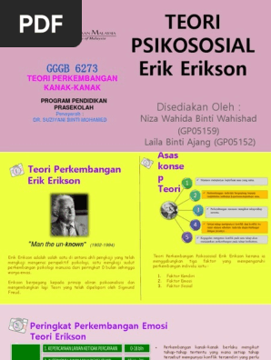 Teori erik erikson pdf. Menurut erikson persamaan ego merupakan element utama dalam teori tingkatan psikososial yang diprakarsai oleh erikson. Teori kepribadian erik erikson adalah salah satu dari beberapa teori kepribadian yang ada. Mereka pindah ke karlsruhe lalu ibunya menikah dengan dr. Unlike freud s theory of psychosexual stages erikson s theory describes the impact of social experience across the whole lifespan.