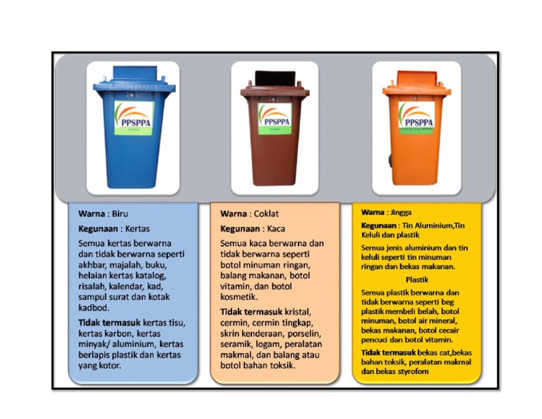 Di malaysia kini terdapat banyak tong tong kitar semula ini. Fungsi warna biru yang terletak pada salah satu tong kitar semula ini adalah untuk menggumpul kertas tong coklat untuk menggumpul kaca dan tong jingga untuk menggumpul tin aluminium dan plastik. Share to twitter share to facebook share to pinterest. Tong tong ini diwarnakan biru coklat dan jingga bagi melambangkan kegunaan yang berbeza.