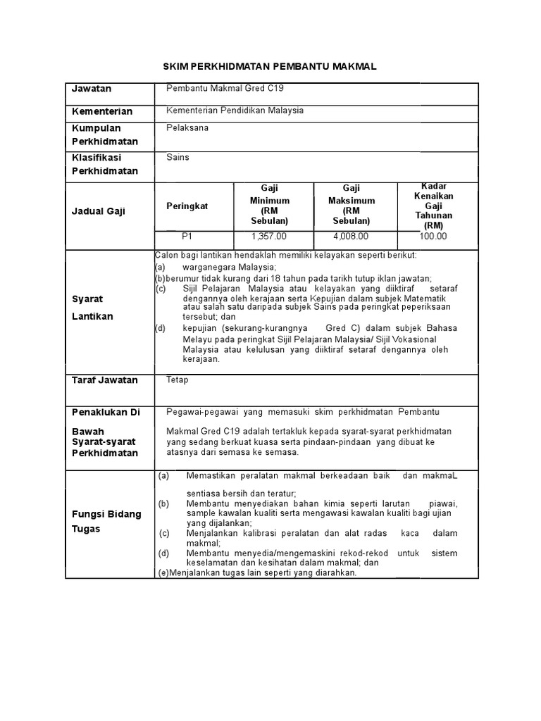 Manakala untuk kadar kenaikan gaji tahunan pembantu makmal awam pula berjumlah rm100 00. Berikut adalah deskripsi tugas jawatan pembantu makmal gred c19. Berikut merupakan tugas pembantu makmal gred c19. Sijil pelajaran malaysia atau kelayakan yang diiktiraf setaraf dengannya oleh kerajaan serta sijil kemahiran malaysia tahap 3 dalam bidang berkaitan atau kelayakan yang diiktiraf setaraf dengannya.