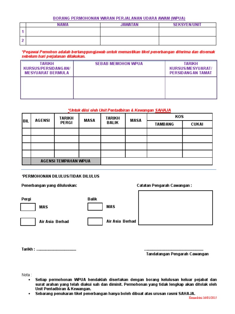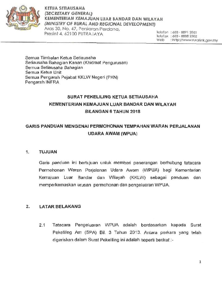 Sebab ramai penjawat awam baru dan peluang nak pergi travel sambil bekerja tu terbuka luas untuk semua kakitangan. Buku wpua ini perlu disimpan selamat dan hanya digunakan oleh pegawai yang diberi kuasa oleh ketua jabatan. Permohonan waran perjalanan udara awam wpua bagi kementerian kemajuan luar bandar dan wilayah kklvv sebagai panduan dan memperkemaskan urusan permohonan dan pengeluaran wpua. Bagi waran perjalanan udara awam pukal manual yang telah disediakan secara manual sebelum ini perlu dikunci masuk setiap butiran untuk tujuan mengemaskini maklumat waran perjalanan udara awam yang telah dikeluarkan oleh semua jabatan ptj yang tidak melalui sistem speks dan bayaran pula akan dibuat secara pukal bulk.